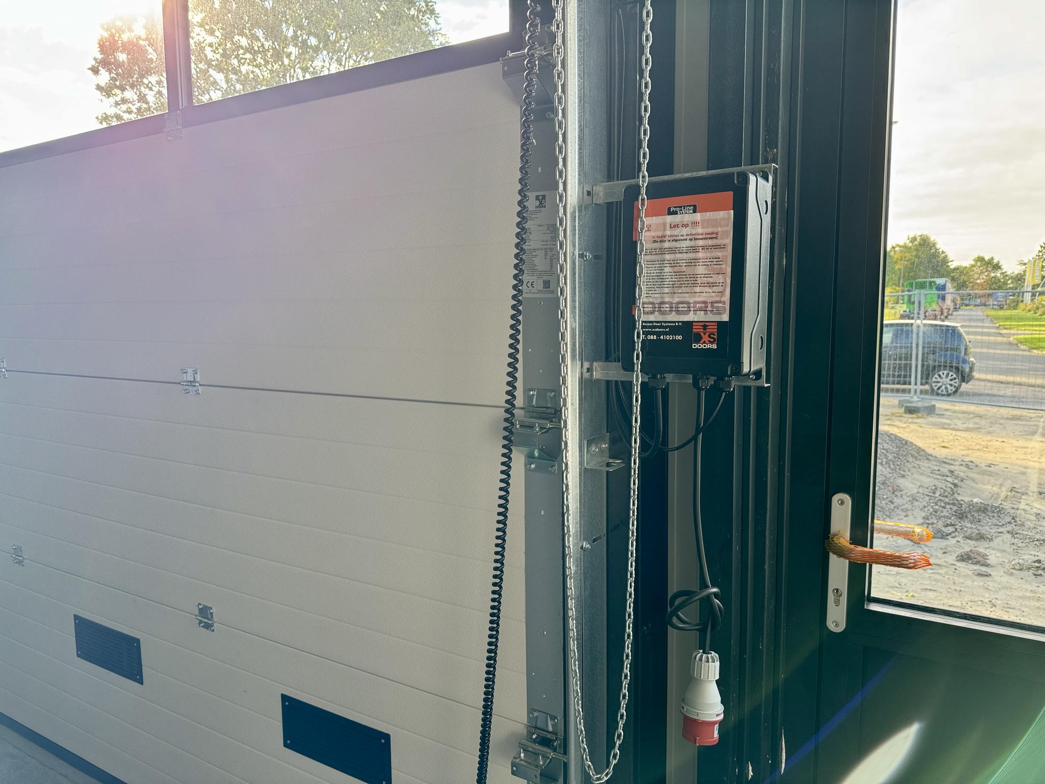 - Elektrisch bedienbare overheaddeur van ca. 3 meter breed en 3,20 meter hoog + separate loopdeur