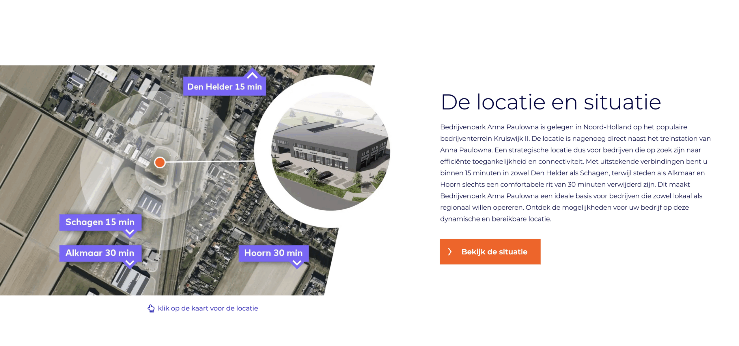 De unit is gelegen op bedrijventerrein Kruiswijk II, met uitstekende bereikbaarheid via de N9 en N249. Station Anna Paulowna ligt op loopafstand, waarmee Schagen en Alkmaar snel bereikbaar zijn.